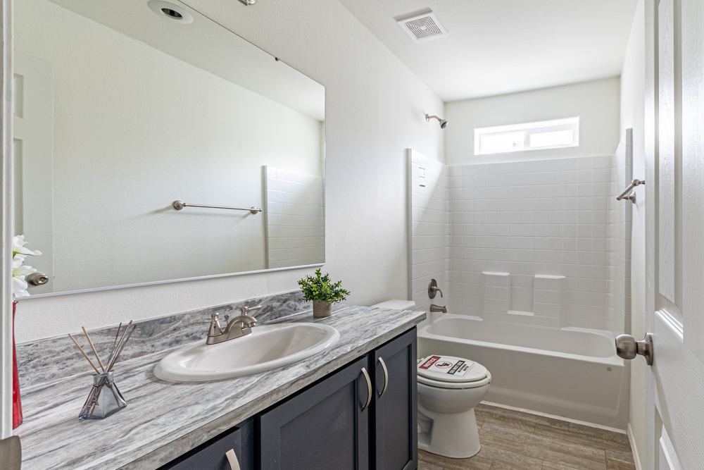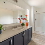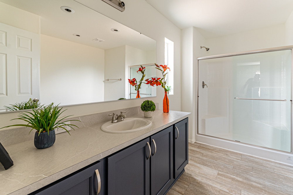 - Fiberglass Shower Stall with Glass Enclosure in Master Bathroom