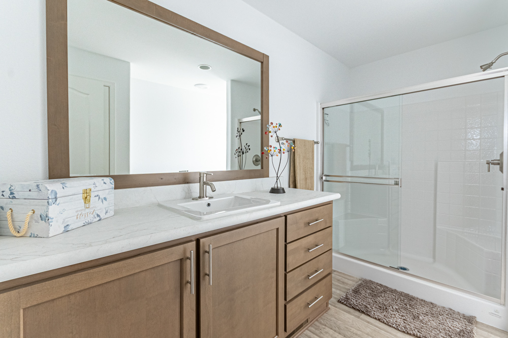 - Fiberglass Stall Shower w/ Glass Enclosure in Primary Bathroom